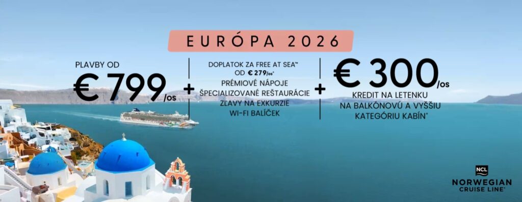 Len po obmedzený čas využite našu 50 % zľavu na všetky plavby*, vybrané plavby v Európe v tomto roku už od €799 na osobu a ešte viac neuveriteľných výhod s našou úplne novou inováciou Free at Sea™, teraz už od €279 na osobu (pri 7-dňovej plavbe), ktorá zahŕňa prémiové nápoje, večere v špecializovaných reštauráciách, zľavy na exkurzie na pobreží a vysokorýchlostné Wi-Fi. Navyše, zarezervujte si teraz plavbu a získajte kredit na letenky až do výšky €300 na osobu na vybrané plavby*, vďaka čomu bude objavovanie starovekých ruín v Európe, obdivovanie aljašských ľadovcov alebo vyhrievanie sa na karibskom slnku jednoduchšie ako kedykoľvek predtým. Táto časovo obmedzená ponuka je platná do 20. apríla 2026.