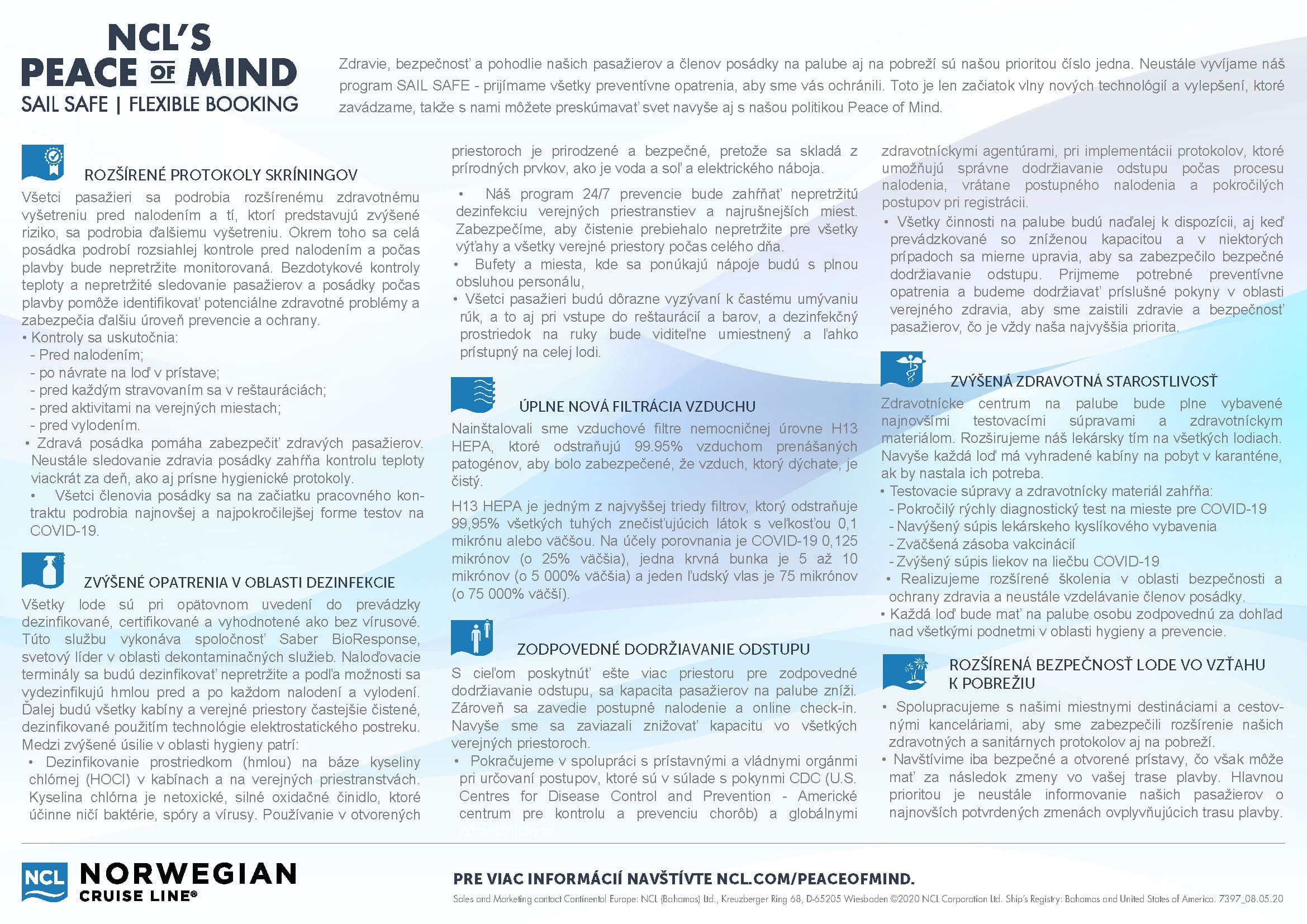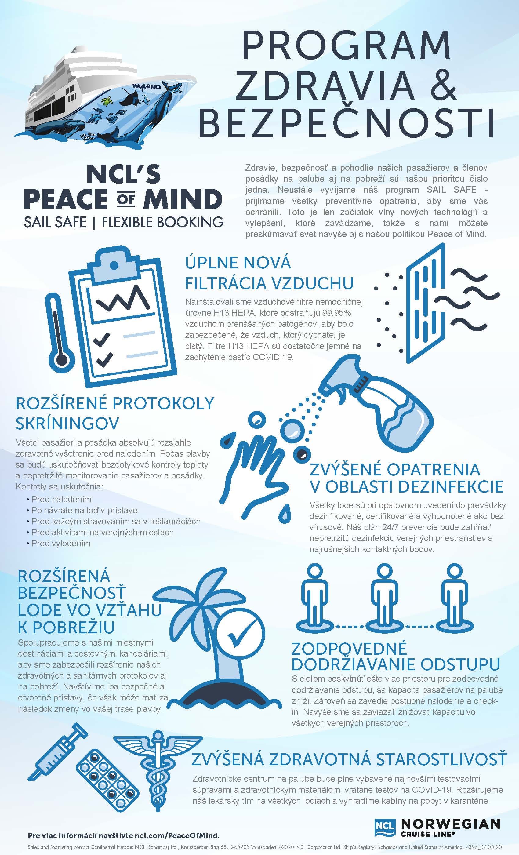 Bezpečnosť, zdravie a pohodlie každého pasažiera a člena posádky plaviaceho sa s NCL bola za posledných 53 rokov, a stále, je prioritou číslo 1 – na palube aj na pobreží. Teraz, viac ako kedykoľvek predtým, prijímame najväčšie opatrenia, úzko spolupracujeme s CDC (Americké centrum pre kontrolu a prevenciu chorôb) a pridávame prísne protokoly, aplikujeme a podporujeme inovácie, aby sme splnili a prekročili ich normy. S Peace of Mind od NCL sa môžete bezpečne plaviť na lodi s vylepšenými protokolmi o ochrane zdravia a bezpečnosti a flexibilitou počas rezervácii. Neváhajte a podľa potreby meňte plány a buďte si istí, že dbáme na vaše zdravie a bezpečnosť.